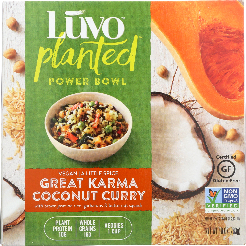 A lightly spiced coconut curry served over brown jasmine rice, garbanzo beans, kale, red bell peppers, black lentils, carrots, cauliflower, and butternut squash.